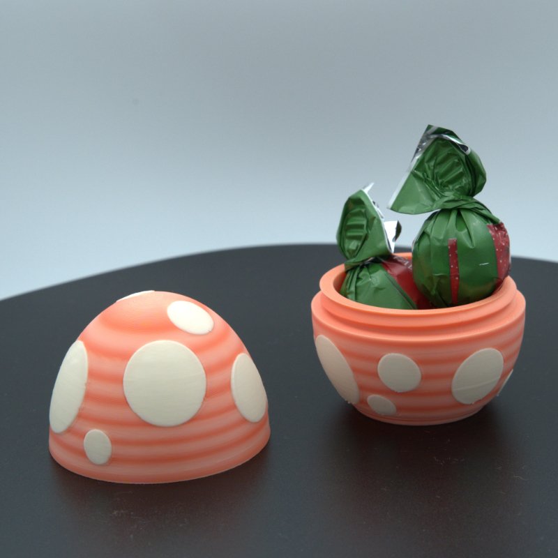 Unikatno dekorativno jajce s pokrovom združuje igriv dizajn in praktično uporabo. Marelična podlaga z nežnimi belimi pikami ustvarja vesel in sodoben videz, ki je popoln za praznično dekoracijo ali kot posebna škatlica za majhna presenečenja.